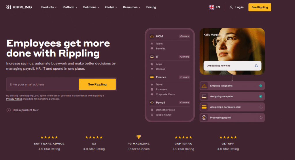 Rippling has taken a fundamentally different approach to the EOR market by building it as one component of a comprehensive HR platform. The system combines payroll, benefits, device management, app access, and employment services into a unified experience that’s genuinely impressive when it all works together.